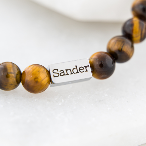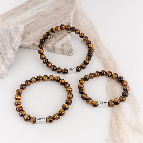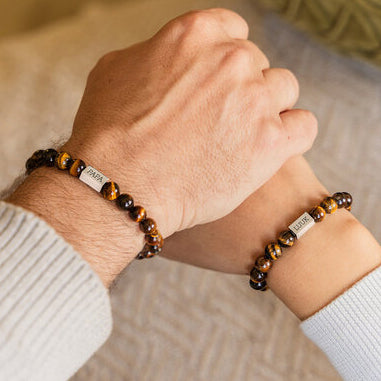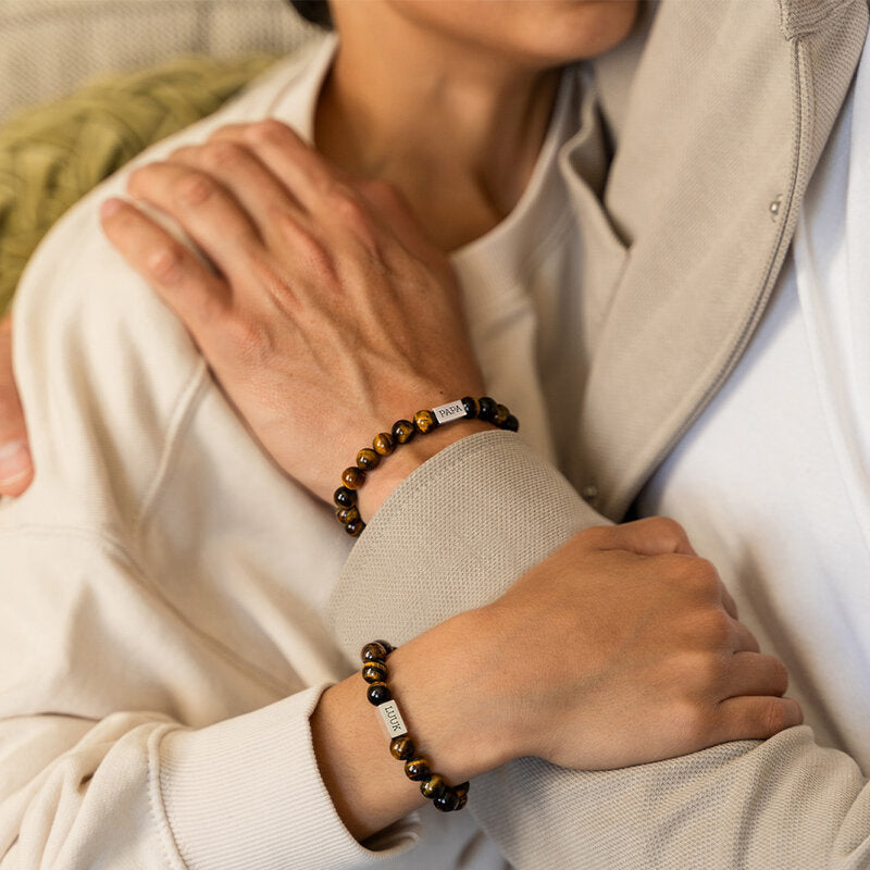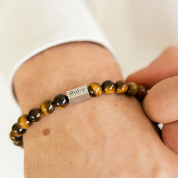 A fashionable, unique, stylish bracelet for men. Whether you're going casual in jeans or attending a formal event. This Customized Tiger Eye Stone Beads Bracelet is a perfect gift for a loved one, personalize it with his name and it will be engraved on the bracelet.